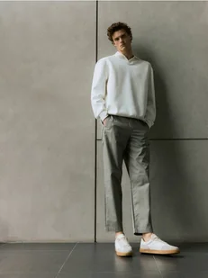 Spodnie typu jogger o regularnym fasonie, wykonane z bawełnianej tkaniny.