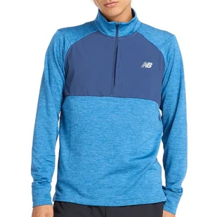 Bluza męska New Balance MT43204HEB – niebieska Wygodna i ciepła bluza męska New Balance z logotypem marki umieszczonym na froncie. Materiał, z którego została wykonano odzież składa się z połączenia uzyskanego w procesie recyklingu poliestru oraz spandexu, który wzbogacono o technologię NB HEAT. Dzięki wykorzystaniu poddanych procesowi recyklingu ziaren kawy, tkanina NB HEAT posiada odpowiednią przędzę, barwniki oraz specjalną powłokę laminującą, która pomaga zapewnić ciepło i odpowiednią temperaturę skóry. Wysoki kołnierz osłania szyję podczas chłodnej i wietrznej pogody. Wygodna i ciepła bluza męska New Balance będzie świetnie pasować do sneakersów i wygodnych spodni dresowych.