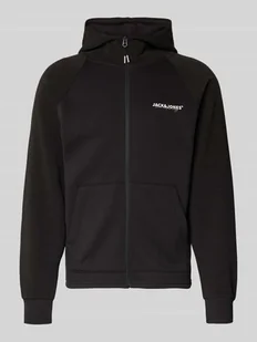Bluza rozpinana męska Jack & Jones;Elastyczna mieszanka materiałów;Krój regular fit;Model ‘Thatcher’;Stójka;Nadruk z logo;Fakturowany wzór;Zamek błyskawiczny na całej długości;Podzielona kieszeń kangurka;Elastyczne mankiety;Długość tyłu w rozmiarze M: 66 cm;Długość rękawa w rozmiarze M: 73 cm