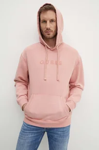 Guess bluza bawełniana męska kolor różowy z kapturem z aplikacją