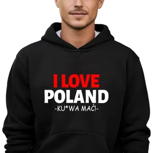 Męska Bluza Czarna Z Kapturem I LOVE POLAND KU*WA MAĆ Śmieszne Wzory - XL