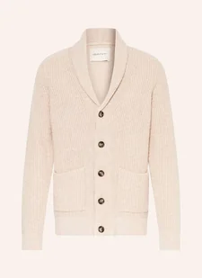 Dzianina prążkowana. Prosty krój. Kołnierz szalowy. Zapięcie na guziki. Nakładane kieszenie. Prążkowane ściągacze przy rękawach i rąbku. Elastyczny materiał z bawełną