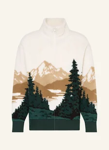 Prosty krój. Stójka zkrótkim zamkiem błyskawicznym. Prążkowane ściągacze przy rękawach i rąbku. Górski krajobraz z wykończeniem żakardowym. Naszywka z logo na rękawie. Puszysty w dotyku materiał. Z polaru żakardowego
