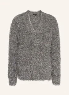 Dzianina strukturalna. Prosty krój. Dekolt w serek. Zapięcie na guziki. Delikatne frędzelki na całej powierzchni. Błyszcząca przędza
