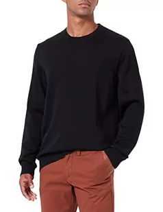 Drobna dzianina. Prosty krój. Okrągły dekolt. Flaga marki na rękawie. Czysta wełna ze strzyży