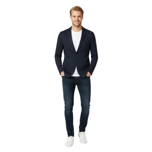 Kolor: Klasyczny granatowy melanż (Navy), niezwykle łatwy w stylizacji. Detale: Klasyczne klapy otwarte. Zapięcie na dwa guziki. Trzy naszywane kieszenie zewnętrzne (dwie dolne oraz jedna na piersi), nadające marynarce mniej formalny charakter. Brak ciężkich usztywnień i pełnej podszewki, co czyni ją lekką i oddychającą.