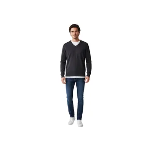Dekolt w serek (V-neck) pięknie wysmukla szyję i eksponuje biżuterię lub kołnierzyk koszuli. Wszechstronność: Świetnie wygląda zarówno z cygaretkami i szpilkami, jak i w luźniejszej wersji z jeansami. Wykończenie: Rękawy oraz dół swetra zakończone są elastycznymi ściągaczami, dzięki czemu sweter zachowuje ładny fason.