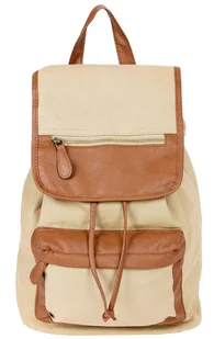 Plecak wykonany jest z beżowej tkaniny z elementami skóry ekologicznej, wewnątrz wyściełany beżowym materiałem. Zapinany na magnes, w środku ściągany dwoma p...