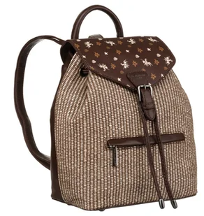 Brązowy duży plecak damski ze skóry ekologicznej i tkaniny funkcjonalny i pojemny kieszonki regulowane szelki mieści a4 DAVID JONES