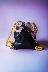 Dziecięcy plecaczek worek wykonany z czarnej błyszczącej ekoskóry. Uszy królika w kwiaty. Bawełniane sznurki w kolorze miodowym. Wyróżnia go bardzo niewielki rozmiar, który idealnie nada się dla dziecka, ...