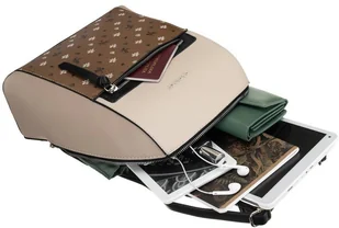 Brązowy duży plecak damski ze skóry ekologicznej i tkaniny funkcjonalny i pojemny kieszonki regulowane szelki mieści a4 DAVID JONES