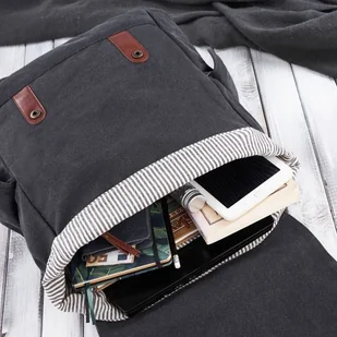 Praktyczny plecak męski Paolo Peruzzi wykonano z bawełnianego, impregnowanego canvasu oraz 100% skóry wegańskiej. Produkt posiada mocne nici oraz designerską, bawełnianą podszewkę w paski. Plecak z powodzeniem mieści format A4 i posiada przegrodę dedykowaną na laptopa (15.6”), wyłożoną pianką dystansową. Zamykany klapą z paskami na magnetyczne napy, po bokach posiada dwie kieszenie zatrzaskowe. Wewnątrz umieszczono kieszonkę na suwak.