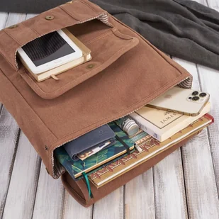 Duży plecak męski wykonano z połączenia z 100% skóry wegańskiej i bawełnianego canvasu o podwyższonej odporności na przetarcia. Produkt posiada mocne szycia oraz designerską podszewkę w paski. Model E–05 jest zabezpieczony paskami na magnetyczne napy. Do dyspozycji klienta jest frontowa kieszonka na napy magnetyczne i pakowna komora główna z dodatkową kieszenią na suwak. Torba została wyposażona w przegrodę na laptopa (15.6”) wzmocnioną pianką dystansową, która zapewnia bezpieczeństwo podczas transportu sprzętów.