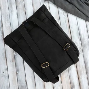 Model E–06 wykonano z połączenia trwałych materiałów – bawełny canvas oraz skóry wegańskiej 100%. Plecak uszyto mocnymi nićmi i w dbałości o detale, zastosowano bawełnianą podszewkę w paski. Zapięcie stanowi karabińczyk z pół-klapą, dodatkowo zabezpieczony od wewnątrz napą magnetyczną. Komora główna z powodzeniem mieści format A4. Dodatkowo we wnętrzu znajduje się mała kieszonka na suwak, na najpotrzebniejsze drobiazgi. Dodatkowo na bokach plecaka umieszczono pionowe kieszenie boczne na suwak.