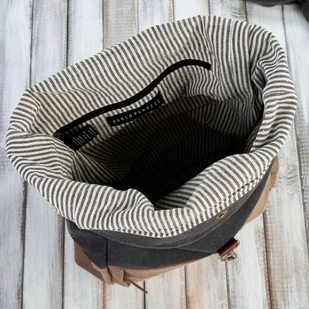 Model E–06 wykonano z połączenia trwałych materiałów – bawełny canvas oraz skóry wegańskiej 100%. Plecak uszyto mocnymi nićmi i w dbałości o detale, zastosowano bawełnianą podszewkę w paski. Zapięcie stanowi karabińczyk z pół-klapą, dodatkowo zabezpieczony od wewnątrz napą magnetyczną. Komora główna z powodzeniem mieści format A4. Dodatkowo we wnętrzu znajduje się mała kieszonka na suwak, na najpotrzebniejsze drobiazgi. Dodatkowo na bokach plecaka umieszczono pionowe kieszenie boczne na suwak.