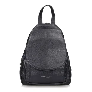 Solidny, wykonany z naturalnej, groszkowej skóry plecak, zawieszony na dwóch paskach i uchu, zawierający cztery przegrody, trzy na zamek i jedną otwartą. Dod...