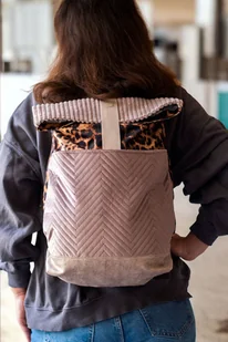 Duży, damski plecak miejski składany i zapinany na rzep wykonany z kilku rodzajów tkanin. Regulowane paski. W środku szara, bawełniana podszewka oraz mała kieszonka na suwak. Plecak jest oryginalny i przyc ...