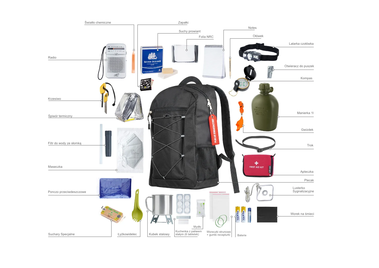 Użytkownik we własnym zakresie powinien uzupełnić plecak o najpotrzebniejsze dokumenty, gotówkę w niewielkich nominałach, ubranie na zmianę, śpiwór lub koc, woda pitna w butelce, żywność o długim terminie przydatności: ryż, makaron, konserwy.