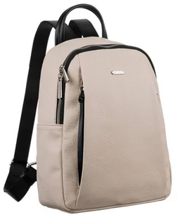 Delikatnie trapezowy, zgrabny plecak damski z frontowymi kieszeniami na suwaki. Model jednokomorowy, wykończony materiałową podszewką. Wyposażony w praktyczną kieszonkę na telefon i zasuwaną przegródkę. Zawieszony na komfortowych, regulowanych szelkach.