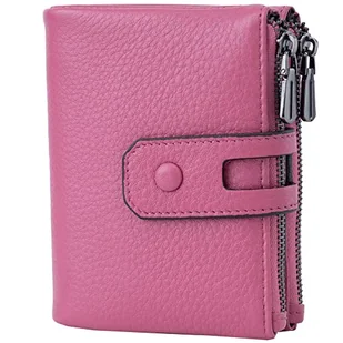 Bveyzi Mały miękki skórzany portfel dla kobiet blokujący RFID damski etui na karty z podwójną kieszenią na zamek błyskawiczny, ciemnoróżowy, S