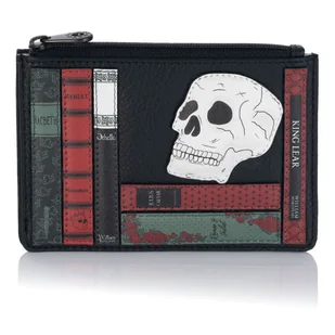 Czarna bilonówka damska Literatura Klasyczna Yoshi Y1321 Bilonówka wykonana z wysokiej jakości skóry naturalnej w czarnym kolorze i ozdobiona naszywką nawiązującą do twórczości Szekspira spodoba się każdej kobiecie, która docenia sztukę i literaturę przez wielkie L. Wzór z okładkami dzieł Szekspira takimi jak Otello, Król Lear czy Makbet oraz hamletowską białą czaszką przyciąga uwagę i nadaje portfelowi odpowiedni stopień dramatyzmu ? Jeśli szukasz bilonówki innej niż wszystkie – ten model jest dla Ciebie. Portfel na monety i karty płatnicze Bilonówka ma orientację poziomą i wymiary 13 cm x 9,5 cm. Posiada jedną zamykaną na zamek kieszeń na monety oraz dwa miejsca na kartę płatniczą lub dowód osobisty na tylnej stronie portfela. Portfel jest w całości objęty systemem RFID, który chroni karty i dokumenty przed zdalnym kopiowaniem i kradzieżą danych.