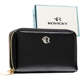 Czarny portfel damski ROVICKY średniej wielkości piórnik na suwak ochrona RFID pojemny na karty elegancki na prezent