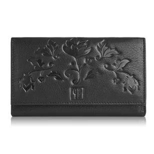 Portfel damski w kwiaty, średniej wielkości. Wykonany ze skóry naturalnej licowej z tłoczeniami na froncie. Wewnątrz 2 przegrody na banknoty, 6 schowków w tym kieszonka na suwak. Dodatkowo 7 przegród na karty kredytowe i transparentna kieszeń, wewnątrz wszywana membrana RFID. Charakterystyka Model: