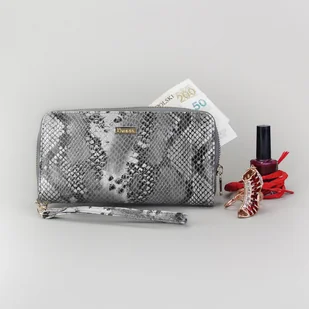 Portfel damski marki Patrizia to idealna propozycja dla kobiet, które cenią połączenie modnego wyglądu z praktycznym wnętrzem. Wykonany z wysokiej jakości naturalnej skóry, przyciąga uwagę stylowym wzorem przypominającym skórę węża. To duży model o poziomej orientacji, który bez problemu zmieści dowód rejestracyjny oraz wszystkie niezbędne dokumenty. Przemyślany układ i komfort użytkowania