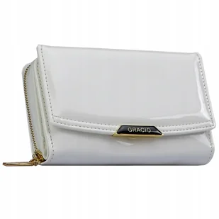 Damski PORTFEL Gracio Skóra EKO Duży Zatrzask Zamek Pudełka Na Prezent Elegancki Portfel Skórzany z RFID – Kompaktowy, Zamek Złoty i Zatrzask Elegancki lakierowany portfel wykonany z wysokiej jakości skóry ekologicznej, w klasycznym Białym kolorze . Jego kompaktowy rozmiar sprawia, że idealnie mieści się w małych damskich torebkach, łącząc funkcjonalność z subtelną elegancją. Precyzyjnie przeszyty nicią, portfel wyróżnia się starannością wykonania. Wyposażony w nowoczesną technologię RFID, zapewnia bezpieczeństwo Twoich kart. Zamek błyskawiczny w złotym odcieniu oraz dodatkowy zatrzask gwarantują wygodę użytkowania i pewność, że zawartość portfela pozostanie w pełni zabezpieczona.