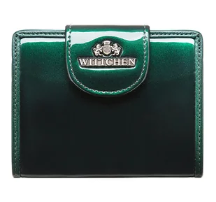 Damski portfel ze skóry lakierowany z ozdobną napą ciemny zielony