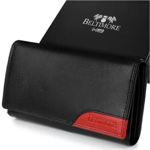 Piękny, skórzany, duży portfel marki Beltimore® w kobiecym stylu, w czarnym kolorze i elegancką czerwoną wstawką. Każdy portfel w środku ma dodatkowo zasuwaną przegrodę dwukomorową na drobne.