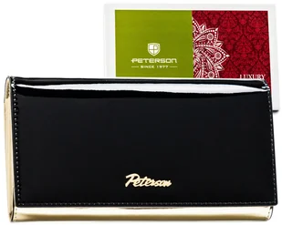 Damski skórzany portfel Peterson lakierowany na zatrzask duża portmonetka na karty z RFID, czarny złoty