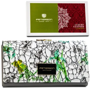Damski portfel Peterson ze skóry naturalnej skórzany ochrona kart RFID Portfel Peterson®️ skórzany lakierowany Stylowy, a zarazem niezwykle praktyczny portfel damski Peterson® to połączenie klasyki z odważnym wzornictwem. Wykonany z wysokiej jakości skóry naturalnej, zachwyca detalami oraz bogactwem miejsca na Twoje codzienne niezbędniki. ❇️ Ceniona marka | Produkt polskiej marki Peterson®, która od wielu lat z ogromnym powodzeniem działa na rynku galanterii skórzanej. ❇️ Wyjątkowy design | Zaprojektowany z klasą i ogromnym wyczuciem stylu. ❇️ Wysokogatunkowy materiał | Odszyty ze specjalnie wyselekcjonowanej lakierowanej skóry naturalnej, która gwarantuje jakość na lata.