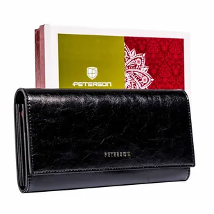 Duży, poziomy portfel damski na zatrzask w kolorze czarnym. Wykonany z wysokojakościowej skóry naturalnej o subtelnym połysku. Wewnątrz zakładki na karty i dokumenty, przegrody na banknoty i bilon. Zapakowany w logowane pudełko Peterson.