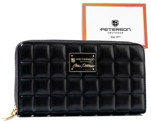 Portfel damski pikowany PETERSON®️ czarny Wyjątkowy portfel damski renomowanej marki PETERSON®, który łączy w sobie ponadczasowy styl, najwyższą jakość wykonania oraz niezwykłą funkcjonalność. Model ten to idealny wybór dla kobiet ceniących nie tylko elegancję, ale również praktyczne rozwiązania na co dzień. #️⃣ Gwarancja jakości | Marka z wieloletnią tradycją, specjalizująca się w produkcji galanterii, oferuje produkty idealnie wpisujące się w najnowsze trendy mody. Nasze kolekcje, w tym portfele, charakteryzują się różnorodnością modeli i kolorów, co pozwala na dopasowanie produktu do indywidualnych potrzeb każdej kobiety. #️⃣ Design i wykonanie | Portfel wykonany z wysokogatunkowej skóry ekologicznej o pikowanej fakturze.