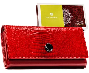 Duży portfel damski PETERSON skórzany lakierowany rozbudowany na karty gotówkę rfid stop czerwony Elegancki portfel damski skórzany z fakturą croco Peterson®️ Amsterdam #️⃣ Naturalna skóra lakierowana | Portfel damski wykonany z wysokogatunkowej skóry naturalnej o lakierowanym wykończeniu, z solidnymi metalowymi okuciami. #️⃣ Pojemne i funkcjonalne wnętrze | Duży portfel damski bez problemu pomieści karty płatnicze, dokumenty, banknoty oraz bilon, zapewniając idealną organizację. #️⃣ Wyrazisty styl premium | Czerwony portfel damski croco łączy klasyczną elegancję z nowoczesnym designem. Tłoczona faktura inspirowana skórą krokodyla podkreśla luksusowy charakter. #️⃣ Ochrona RFID | Skórzany portfel damski wyposażony w system RFID, który chroni dane zapisane na kartach przed kradzieżą.