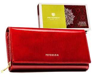 Skórzany portfel damski portmonetka czerwona RFID pojemna PETERSON prezent Duży portfel damski skórzany z prążkowanym wzorem Peterson® #️⃣ Ceniona marka | Elegancki portfel damski skórzany Peterson® renomowanej marki galanteryjnej, która od lat cieszy się zaufaniem klientek i gwarantuje wysoką jakość na długie lata użytkowania. #️⃣ Najwyższa jakość wykonania | Duży portfel damski wykonany z naturalnej skóry o lakierowanej fakturze. Precyzyjne szycie i dbałość o detale sprawiają, że portfel prezentuje się niezwykle elegancko. Pod warstwą lakieru widoczny jest stylowy prążkowany wzór. #️⃣ Bardzo przestronny portfel damski | Model oferuje liczne przegródki, kieszenie i komory, dzięki którym portfel bez problemu pomieści karty płatnicze, dokumenty, banknoty oraz bilon.