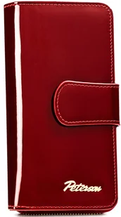 Elegancki czerwony pionowy portfel damski na zatrzask i suwak PETERSON lakierowana skóra naturalna rozbudowany na karty dokumenty i gotówkę pudełko ..