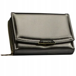 GRACIO Duży Portfel Skórzany Na Prezent + Pudełko Srebrny Zamykany Na Zamek Elegancki Portfel Skórzany z RFID – Kompaktowy, Zamek Złoty i Zatrzask Elegancki lakierowany portfel wykonany z wysokiej jakości skóry ekologicznej, w klasycznym metalicznym kolorze GUN. Jego kompaktowy rozmiar sprawia, że idealnie mieści się w małych damskich torebkach, łącząc funkcjonalność z subtelną elegancją. Precyzyjnie przeszyty nicią, portfel wyróżnia się starannością wykonania. Wyposażony w nowoczesną technologię RFID, zapewnia bezpieczeństwo Twoich kart. Zamek błyskawiczny w złotym odcieniu oraz dodatkowy zatrzask gwarantują wygodę użytkowania i pewność, że zawartość portfela pozostanie w pełni zabezpieczona.