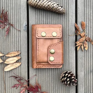 Jasno brązowy portfel skórzany ręcznie uszyty na bilon o karty.