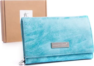 Specyfikacja: Portmonetka damska w kolorze jasnym turkusowym, niemieckiej marki Jennifer Jones. Produkt w wygodnym, średnim rozmiarze. Wykonany z miękkiej skóry ekologicznej, miłej w dotyku, subtelnie cieniowanej. Z przodu, portmonetka zapinana jest na dużą patkę z metalowym zatrzaskiem.