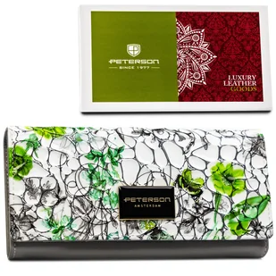 Klasyczny skórzany portfel damski szary z kwiatowym motywem PETERSON rozbudowany na karty gotókę schowek na suwak elegancki pudełko na prezent ochro..
