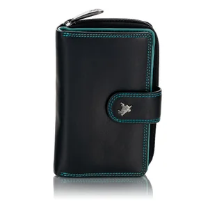 Kolorowy portfel damski na zatrzask Visconti R-13 RFID - czarny Kobietom lubiącym dodatki z charakterem, które świetnie wyglądają i są wykonane z najlepszych materiałów oraz cieszą oko dedykujemy ten portfel damski brytyjskiej marki Visconti. Portfel zachwyci Cię oryginalnym połączeniem czarnej okładki i kolorowego wnętrza oraz doskonałym wykończeniem. Efektowne kolory wprowadzą Cię w na pewno w pozytywny nastrój! Pojemny portfel, aż 18 miejsc na karty Prezentowany portfel wykonany został z miękkiej skóry naturalnej. To model średniej wielkości, o wymiarach 9 cm x 14,5 cm. W części zamykanej na zatrzask posiada przegrodę na banknoty, aż 16 kieszonek na karty płatnicze, w tym dwie przezroczyste, idealne na zdjęcie bliskiej osoby, a także 6 szerokich kieszeni na bilety i notatki.
