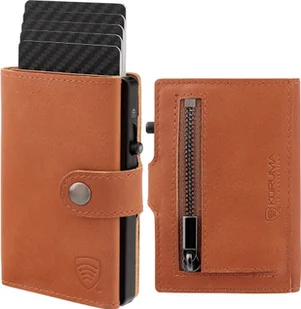 KORUMA Skórzany portfel męski z kieszenią na bilon oraz aluminiowym etui z wysuwanymi kartami brązowy Uniwersalny