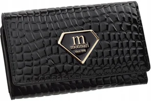 Elegancki portfel damski. Zamyka się klapką na napę, ozdobioną eleganckim, złotym logo marki. Wewnątrz znajduje się wiele przegródek na karty, przegroda na banknoty oraz miejsce na zdjęcie. Portfel posiada również kieszonkę na monety zapinaną na złoty suwak. Materiał: Skóra naturalna Wysokość: