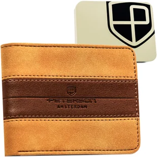 Modny portfel męski w dwóch odcieniach brązu skóra PETERSON mały poziomy bez zapięcia skóra ekologiczna nowoczesny slim do kieszeni pudełko prezento..