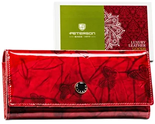PETERSON Duży czerwony skórzany portfel damski lakierowany ochrona kart RFID Duży portfel damski skórzany w motyle Peterson® #️⃣ Wysokogatunkowe materiały | Wyszyty z dbałością o detale ze wysokogatunkowej lakierowanej skóry naturalnej z solidnymi, metalowymi okuciami. #️⃣ Duża pojemność | Portfel oferuje niezwykle pojemne wnętrze, co sprawia, że bez problemu pomieści wszystkie karty, wizytówki, dokumenty i dodatkowe przedmioty, jakie potrzebujesz mieć zawsze przy sobie. #️⃣ Klasa i szyk | Wygląd portfela łączy szacunek do ubiegłych lat z nowoczesnymi akcentami. Dzięki temu jest on niezwykle gustowny, ma wyrafinowany charakter i jest przy tym bardzo uniwersalny. #️⃣ Antykradzieżowy | Wyposażony w specjalny system antykradzieżowy RFID dla wiekszego bezpieczeństwa Ciebie i Twoich danych.
