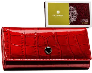 PETERSON duży i pojemny skórzany portfel damski lakierowany czerwony ochrona kart RFID Duży portfel damski ze skóry lakierowanej z RFID Peterson® #️⃣ Wysokogatunkowe materiały | Wyszyty z dbałością o detale ze wysokogatunkowej lakierowanej skóry naturalnej z solidnymi, metalowymi okuciami. #️⃣ Duża pojemność | Portfel oferuje niezwykle pojemne wnętrze, co sprawia, że bez problemu pomieści wszystkie karty, wizytówki, dokumenty i dodatkowe przedmioty, jakie potrzebujesz mieć zawsze przy sobie. #️⃣ Klasa i szyk | Wygląd portfela łączy szacunek do ubiegłych lat z nowoczesnymi akcentami. Dzięki temu jest on niezwykle gustowny, ma wyrafinowany charakter i jest przy tym bardzo uniwersalny. #️⃣ Antykradzieżowy | Wyposażony w specjalny system antykradzieżowy RFID dla wiekszego bezpieczeństwa Ciebie i Twoich danych.