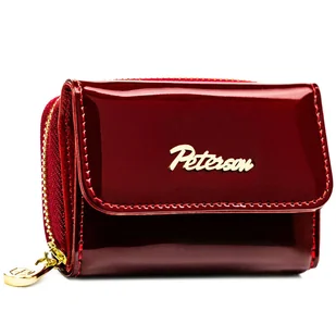 Elegancki lakierowany czerwony mały portfel damski na gotówkę PETERSON skórzana portmonetka na zatrzask i suwak złote okucia pudełko prezentowe ochr..