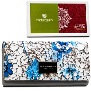 Dzięki unikalnemu, kwiatowemu wzorowi na lakierowanej skórze naturalnej, ten model wyróżnia się na tle innych i staje się prawdziwą ozdobą każdej stylizacji. ➡️ Stylowe połączenie faktur – front portfela ozdobiony jest barwnym, lakierowanym wzorem kwiatowym, który kontrastuje z gładkim, eleganckim tyłem w neutralnym odcieniu szarości. ➡️ Luksusowe detale – na froncie portfela umieszczone jest prestiżowe logo Peterson® w czarnym, błyszczącym wykończeniu, które dodaje ekskluzywnego charakteru. ➡️ Ponadczasowa elegancja – unikalny design sprawia, że portfel pasuje zarówno do codziennych, jak i bardziej wyrafinowanych stylizacji, dodając im subtelnej klasy. Ten portfel to doskonały wybór dla kobiet, które cenią sobie wyjątkowy styl i praktyczność w jednym! Organizacja wnętrza Nasz portfel nie tylko dobrze wygląda, ale jest także funkcjonalny, z odpowiednio zaplanowanymi przegrodami, co pomaga w lepszym zorganizowaniu kart, gotówki i dokumentów.